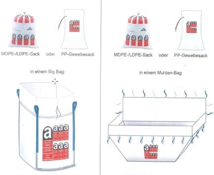 - In den Gebinden dürfen sich ausschliesslich asbesthaltiger Bauabfälle gemäss LVA / VeVA-Code 17 06 98 (z. B. Eternit) befinden. Alle anderen Materialien sind offen anzuliefern.